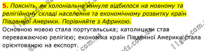 5. Поясніть, як колоніальне минуле відбилося на мовному та релігійному складі населення та економічному розвитку країн Південної Америки. Порівняйте з Африкою. Основною мовою стала португальська; католицизм став переважаючою релігією; економіка країн Південної Америки стала орієнтованою на експорт.