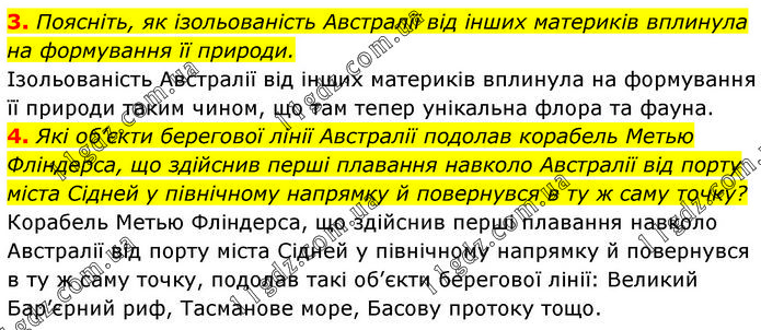 3. Поясніть, як ізольованість Австралії від інших материків вплинула на формування її природи. Ізольованість Австралії від інших материків вплинула на формування її природи таким чином, що там тепер унікальна флора та фауна. 4. Які об’єкти берегової лінії Австралії подолав корабель Метью Фліндерса, що здійснив перші плавання навколо Австралії від порту міста Сідней у північному напрямку й повернувся в ту ж саму точку? Корабель Метью Фліндерса, що здійснив перші плавання навколо Австралії від порту міста Сідней у північному напрямку й повернувся в ту ж саму точку, подолав такі об’єкти берегової лінії: Великий Бар’єрний риф, Тасманове море, Басову протоку тощо.