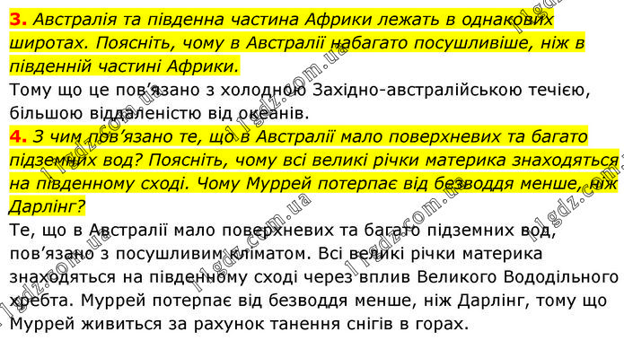 3. Австралія та південна частина Африки лежать в однакових широтах. Поясніть, чому в Австралії набагато посушливіше, ніж в південній частині Африки. Тому що це пов’язано з холодною Західно-австралійською течією, більшою віддаленістю від океанів. 4. З чим пов’язано те, що в Австралії мало поверхневих та багато підземних вод? Поясніть, чому всі великі річки материка знаходяться на південному сході. Чому Муррей потерпає від безводдя менше, ніж Дарлінг? Те, що в Австралії мало поверхневих та багато підземних вод, пов’язано з посушливим кліматом. Всі великі річки материка знаходяться на південному сході через вплив Великого Вододільного хребта. Муррей потерпає від безводдя менше, ніж Дарлінг, тому що Муррей живиться за рахунок танення снігів в горах.