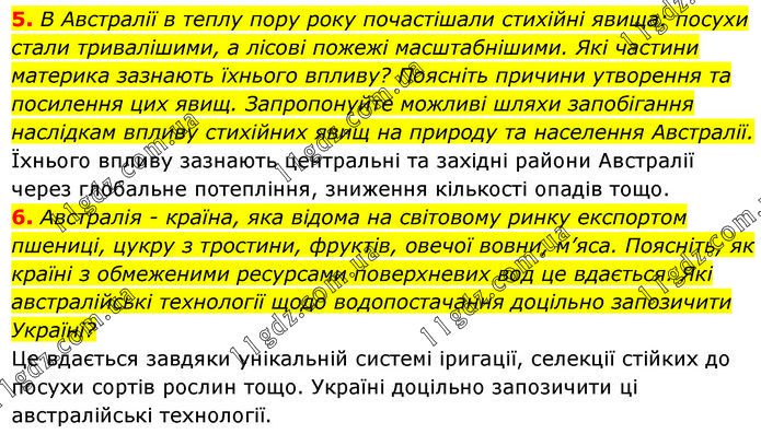 5. В Австралії в теплу пору року почастішали стихійні явища: посухи стали тривалішими, а лісові пожежі масштабнішими. Які частини материка зазнають їхнього впливу? Поясніть причини утворення та посилення цих явищ. Запропонуйте можливі шляхи запобігання наслідкам впливу стихійних явищ на природу та населення Австралії. Їхнього впливу зазнають центральні та західні райони Австралії через глобальне потепління, зниження кількості опадів тощо. 6. Австралія - країна, яка відома на світовому ринку експортом пшениці, цукру з тростини, фруктів, овечої вовни, м’яса. Поясніть, як країні з обмеженими ресурсами поверхневих вод це вдається. Які австралійські технології щодо водопостачання доцільно запозичити Україні? Це вдається завдяки унікальній системі іригації, селекції стійких до посухи сортів рослин тощо. Україні доцільно запозичити ці австралійські технології.