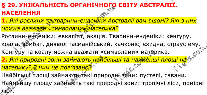 § 29. УНІКАЛЬНІСТЬ ОРГАНІЧНОГО СВІТУ АВСТРАЛІЇ. НАСЕЛЕННЯ 1. Які рослини та тварини-ендеміки Австралії вам відомі? Які з них можна вважати «символами» материка? Рослини-ендеміки: евкаліпт, акація. Тварини-ендеміки: кенгуру, коала, вомбат, диявол тасманійський, качконіс, єхидна, страус ему. Кенгуру та коалу можна вважати «символами» материка. 2. Які природні зони займають найбільші та найменші площі на материку? З чим це пов’язано? Найбільші площі займають такі природні зони: пустелі, савани. Найменшу площу займають такі природні зони: тропічні ліси, помірні ліси.