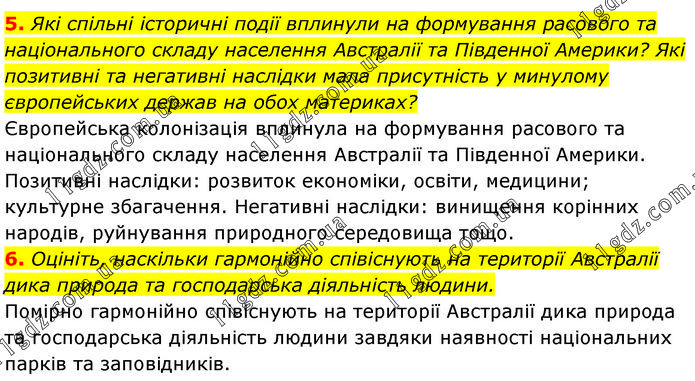 5. Які спільні історичні події вплинули на формування расового та національного складу населення Австралії та Південної Америки? Які позитивні та негативні наслідки мала присутність у минулому європейських держав на обох материках? Європейська колонізація вплинула на формування расового та національного складу населення Австралії та Південної Америки. Позитивні наслідки: розвиток економіки, освіти, медицини; культурне збагачення. Негативні наслідки: винищення корінних народів, руйнування природного середовища тощо. 6. Оцініть, наскільки гармонійно співіснують на території Австралії дика природа та господарська діяльність людини. Помірно гармонійно співіснують на території Австралії дика природа та господарська діяльність людини завдяки наявності національних парків та заповідників.
