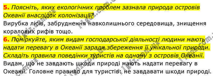 5. Поясніть, яких екологічних проблем зазнала природа островів Океанії внаслідок колонізації? Вирубка лісів, забруднення навколишнього середовища, знищення коралових рифів тощо. 6. Поміркуйте, яким видам господарської діяльності людини мають надати перевагу в Океанії заради збереження її унікальної природи. Складіть правила поведінки туристів на одному з островів Океанії. Видам, що не завдають шкоди природі мають надати перевагу в Океанії. Головне правило для туристів: не завдавати шкоди природі.