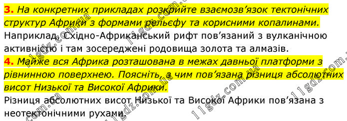 3. На конкретних прикладах розкрийте взаємозв’язок тектонічних структур Африки з формами рельєфу та корисними копалинами. Наприклад, Східно-Африканський рифт пов’язаний з вулканічною активністю і там зосереджені родовища золота та алмазів. 4. Майже вся Африка розташована в межах давньої платформи з рівнинною поверхнею. Поясніть, з чим пов’язана різниця абсолютних висот Низької та Високої Африки. Різниця абсолютних висот Низької та Високої Африки пов’язана з неотектонічними рухами.