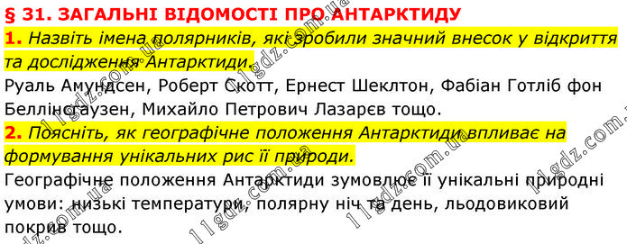 § 31. ЗАГАЛЬНІ ВІДОМОСТІ ПРО АНТАРКТИДУ 1. Назвіть імена полярників, які зробили значний внесок у відкриття та дослідження Антарктиди. Руаль Амундсен, Роберт Скотт, Ернест Шеклтон, Фабіан Готліб фон Беллінсгаузен, Михайло Петрович Лазарєв тощо. 2. Поясніть, як географічне положення Антарктиди впливає на формування унікальних рис її природи. Географічне положення Антарктиди зумовлює її унікальні природні умови: низькі температури, полярну ніч та день, льодовиковий покрив тощо.