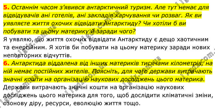 5. Останнім часом з’явився антарктичний туризм. Але тут немає для відвідувачів ані готелів, ані закладів харчування чи розваг. Як ви уявляєте життя охочих відвідати Антарктиду? Чи хотіли б ви побувати та цьому материку й заради чого? Я уявляю, що життя охочих відвідати Антарктиду є дещо хаотичним та енергійним. Я хотів би побувати на цьому материку заради нових неповторних відчуттів. 6. Антарктида віддалена від інших материків тисячами кілометрів, на ній немає постійних жителів. Поясніть, для чого держави витрачають значні кошти на організацію наукових досліджень цього материка. Держави витрачають значні кошти на організацію наукових досліджень цього материка для того, щоб дослідити кліматичні зміни, озонову діру, ресурси, еволюцію життя тощо.