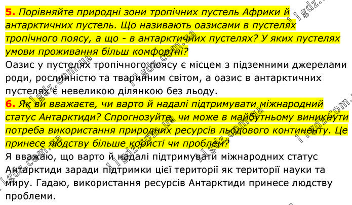5. Порівняйте природні зони тропічних пустель Африки й антарктичних пустель. Що називають оазисами в пустелях тропічного поясу, а що - в антарктичних пустелях? У яких пустелях умови проживання більш комфортні? Оазис у пустелях тропічного поясу є місцем з підземними джерелами роди, рослинністю та тваринним світом, а оазис в антарктичних пустелях є невеликою ділянкою без льоду. 6. Як ви вважаєте, чи варто й надалі підтримувати міжнародний статус Антарктиди? Спрогнозуйте, чи може в майбутньому виникнути потреба використання природних ресурсів льодового континенту. Це принесе людству більше користі чи проблем? Я вважаю, що варто й надалі підтримувати міжнародних статус Антарктиди заради підтримки цієї території як території науки та миру. Гадаю, використання ресурсів Антарктиди принесе людству проблеми.