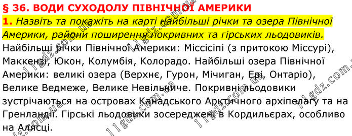 § 36. ВОДИ СУХОДОЛУ ПІВНІЧНОЇ АМЕРИКИ 1. Назвіть та покажіть на карті найбільші річки та озера Північної Америки, райони поширення покривних та гірських льодовиків. Найбільші річки Північної Америки: Міссісіпі (з притокою Міссурі), Маккензі, Юкон, Колумбія, Колорадо. Найбільші озера Північної Америки: великі озера (Верхнє, Гурон, Мічиган, Ері, Онтаріо), Велике Ведмеже, Велике Невільниче. Покривні льодовики зустрічаються на островах Канадського Арктичного архіпелагу та на Гренландії. Гірські льодовики зосереджені в Кордильєрах, особливо на Алясці.