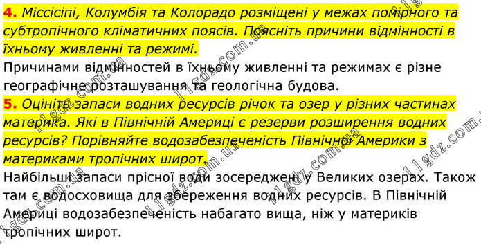 4. Міссісіпі, Колумбія та Колорадо розміщені у межах помірного та субтропічного кліматичних поясів. Поясніть причини відмінності в їхньому живленні та режимі. Причинами відмінностей в їхньому живленні та режимах є різне географічне розташування та геологічна будова. 5. Оцініть запаси водних ресурсів річок та озер у різних частинах материка. Які в Північній Америці є резерви розширення водних ресурсів? Порівняйте водозабезпеченість Північної Америки з материками тропічних широт. Найбільші запаси прісної води зосереджені у Великих озерах. Також там є водосховища для збереження водних ресурсів. В Північній Америці водозабезпеченість набагато вища, ніж у материків тропічних широт.