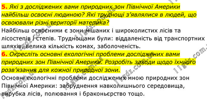 5. Які з досліджених вами природних зон Північної Америки найбільш освоєні людиною? Які труднощі з’являлися в людей, що освоювали різні території материка? Найбільш освоєними є зони мішаних і широколистих лісів та лісостепів і степів. Труднощами були: віддаленість від транспортних шляхів, велика кількість комах, заболоченість. 6. Окресліть основні екологічні проблеми досліджених вами природних зон Північної Америки. Розробіть заходи щодо їхнього розв’язання для кожної природної зони. Основні екологічні проблеми досліджених мною природних зон Північної Америки: забруднення навколишнього середовища, вирубка лісів, полювання і браконьєрство тощо.