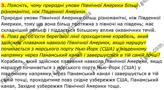 3. Поясніть, чому природні умови Північної Америки більш різноманітні, ніж Південної Америки. Природні умови Північної Америки більш різноманітні, ніж Південної Америки, тому що вона більш протяжна з півночі на південь; має складніший рельєф і піддається більшому вплив океанічних течій. 4. Повз які об’єкти берегової лінії проходитиме корабель, який здійснює плавання навколо Північної Америки, якщо маршрут починається з морського порту Нью-Йорк (США) у південному напрямку через Панамський канал і завершується в тій самій точці? Корабель, який здійснює плавання навколо Північної Америки, якщо маршрут починається з морського порту Нью-Йорк (США) у південному напрямку через Панамський канал і завершується в тій самій точці, проходитиме повз східне узбережжя США, Панамський канал, Західне узбережжя Північної Америки тощо.