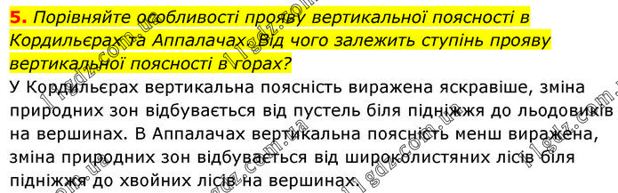 Порівняйте особливості прояву вертикальної поясності в Кордильєрах та Аппалачах. Від чого залежить ступінь прояву вертикальної поясності в горах? У Кордильєрах вертикальна поясність виражена яскравіше, зміна природних зон відбувається від пустель біля підніжжя до льодовиків на вершинах. В Аппалачах вертикальна поясність менш виражена, зміна природних зон відбувається від широколистяних лісів біля підніжжя до хвойних лісів на вершинах.