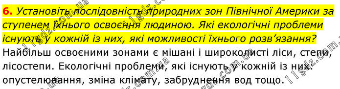Установіть послідовність природних зон Північної Америки за ступенем їхнього освоєння людиною. Які екологічні проблеми існують у кожній із них, які можливості їхнього розв’язання? Найбільш освоєними зонами є мішані і широколисті ліси, степи, лісостепи. Екологічні проблеми, які існують у кожній із них: опустелювання, зміна клімату, забруднення вод тощо.