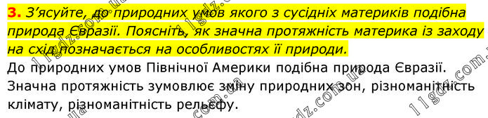 З’ясуйте, до природних умов якого з сусідніх материків подібна природа Євразії. Поясніть, як значна протяжність материка із заходу на схід позначається на особливостях її природи. До природних умов Північної Америки подібна природа Євразії. Значна протяжність зумовлює зміну природних зон, різноманітність клімату, різноманітність рельєфу.