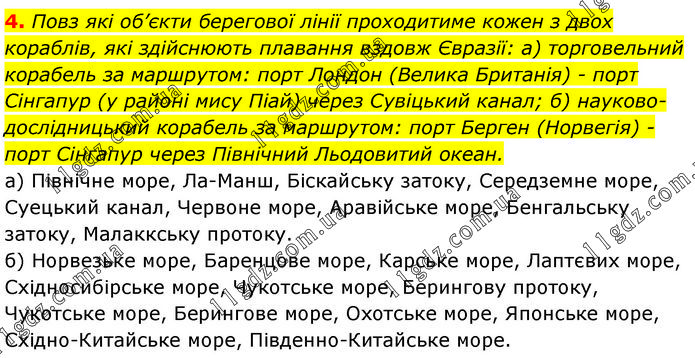 Повз які об’єкти берегової лінії проходитиме кожен з двох кораблів, які здійснюють плавання вздовж Євразії: а) торговельний корабель за маршрутом: порт Лондон (Велика Британія) - порт Сінгапур (у районі мису Піай) через Сувіцький канал; б) науково-дослідницький корабель за маршрутом: порт Берген (Норвегія) - порт Сінгапур через Північний Льодовитий океан. а) Північне море, Ла-Манш, Біскайську затоку, Середземне море, Суецький канал, Червоне море, Аравійське море, Бенгальську затоку, Малаккську протоку. б) Норвезьке море, Баренцове море, Карське море, Лаптєвих море, Східносибірське море, Чукотське море, Берингову протоку, Чукотське море, Берингове море, Охотське море, Японське море, Східно-Китайське море, Південно-Китайське море.