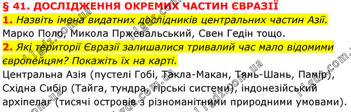 § 41. ДОСЛІДЖЕННЯ ОКРЕМИХ ЧАСТИН ЄВРАЗІЇ 1. Назвіть імена видатних дослідників центральних частин Азії. Марко Поло, Микола Пржевальський, Свен Гедін тощо. 2. Які території Євразії залишалися тривалий час мало відомими європейцям? Покажіть їх на карті. Центральна Азія (пустелі Гобі, Такла-Макан, Тянь-Шань, Памір), Східна Сибір (Тайга, тундра, гірські системи), індонезійський архіпелаг (тисячі островів з різноманітними природними умовами).