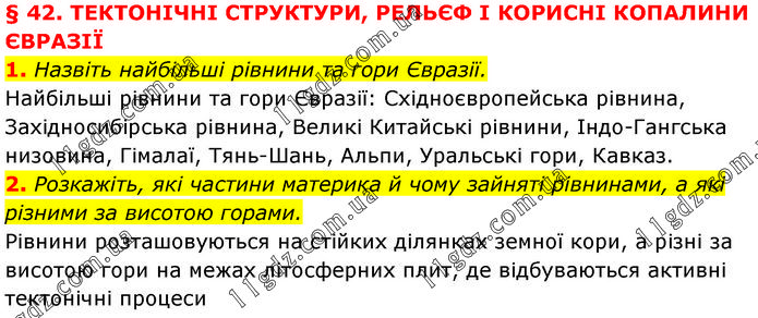 § 42. ТЕКТОНІЧНІ СТРУКТУРИ, РЕЛЬЄФ І КОРИСНІ КОПАЛИНИ ЄВРАЗІЇ 1. Назвіть найбільші рівнини та гори Євразії. Найбільші рівнини та гори Євразії: Східноєвропейська рівнина, Західносибірська рівнина, Великі Китайські рівнини, Індо-Гангська низовина, Гімалаї, Тянь-Шань, Альпи, Уральські гори, Кавказ. 2. Розкажіть, які частини материка й чому зайняті рівнинами, а які різними за висотою горами. Рівнини розташовуються на стійких ділянках земної кори, а різні за висотою гори на межах літосферних плит, де відбуваються активні тектонічні процеси.