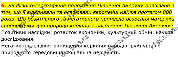 Як фізико-географічне положення Північної Америки пов’язане з тим, що її відкривали та освоювали європейці майже протягом 800 років. Що позитивного та негативного принесло освоєння материка європейцями для природи корінного населення Північної Америки? Позитивні наслідки: розвиток економіки, культурний обмін, наукові дослідження. Негативні наслідки: винищення корінних народів, руйнування природного середовища, соціальна нерівність.