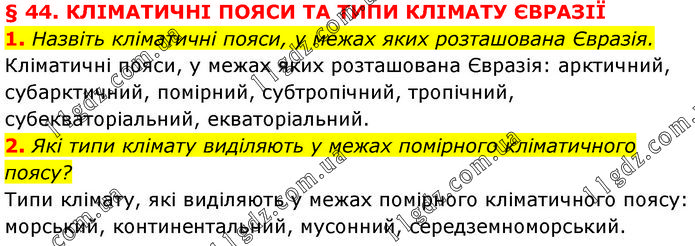 § 44. КЛІМАТИЧНІ ПОЯСИ ТА ТИПИ КЛІМАТУ ЄВРАЗІЇ 1. Назвіть кліматичні пояси, у межах яких розташована Євразія. Кліматичні пояси, у межах яких розташована Євразія: арктичний, субарктичний, помірний, субтропічний, тропічний, субекваторіальний, екваторіальний. 2. Які типи клімату виділяють у межах помірного кліматичного поясу? Типи клімату, які виділяють у межах помірного кліматичного поясу: морський, континентальний, мусонний, середземноморський.