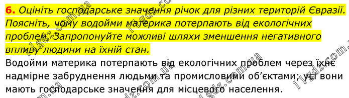 Оцініть господарське значення річок для різних територій Євразії. Поясніть, чому водойми материка потерпають від екологічних проблем. Запропонуйте можливі шляхи зменшення негативного впливу людини на їхній стан. Водойми материка потерпають від екологічних проблем через їхнє надмірне забруднення людьми та промисловими об’єктами; усі вони мають господарське значення для місцевого населення.