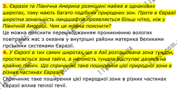 3. Євразія та Північна Америка розміщені майже в однакових широтах, тому мають багато подібних природних зон. Проте в Євразії широтна зональність ландшафтів проявляється більш чітко, ніж у Північній Америці. Чим це можна пояснити? Це можна пояснити перешкоджанням проникненню вологих повітряних мас з океанів у внутрішні райони материка Великими гірськими системами Євразії. 4. У Європі в тих самих широтах, де в Азії розташована зона тундри, простягається зона тайги, а натомість тундра відступає далеко на крайню північ. Що спричиняє таке поширення цієї природної зони в різних частинах Євразії? Спричиняє таке поширення цієї природної зони в різних частинах Євразії вплив теплої течії.