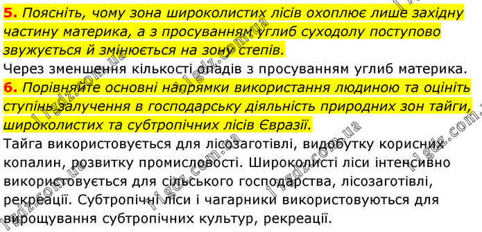5. Поясніть, чому зона широколистих лісів охоплює лише західну частину материка, а з просуванням углиб суходолу поступово звужується й змінюється на зону степів. Через зменшення кількості опадів з просуванням углиб материка. 6. Порівняйте основні напрямки використання людиною та оцініть ступінь залучення в господарську діяльність природних зон тайги, широколистих та субтропічних лісів Євразії. Тайга використовується для лісозаготівлі, видобутку корисних копалин, розвитку промисловості. Широколисті ліси інтенсивно використовується для сільського господарства, лісозаготівлі, рекреації. Субтропічні ліси і чагарники використовуються для вирощування субтропічних культур, рекреації.