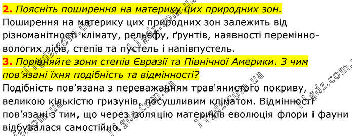 2. Поясніть поширення на материку цих природних зон. Поширення на материку цих природних зон залежить від різноманітності клімату, рельєфу, ґрунтів, наявності перемінно-вологих лісів, степів та пустель і напівпустель. 3. Порівняйте зони степів Євразії та Північної Америки. З чим пов’язані їхня подібність та відмінності? Подібність пов’язана з переважанням трав'янистого покриву, великою кількістю гризунів, посушливим кліматом. Відмінності пов’язані з тим, що через ізоляцію материків еволюція флори і фауни відбувалася самостійно.