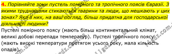 Порівняйте зони пустель помірного та тропічного поясів Євразії. З якими труднощами стикаються тварини та люди, що мешкають у цих зонах? Яка з них, на ваш погляд, більш придатна для господарської діяльності людини? Пустелі помірного поясу (мають більш континентальний клімат, великі добові перепади температур). Пустелі тропічного поясу (мають високі температури протягом усього року, мала кількість опадів).