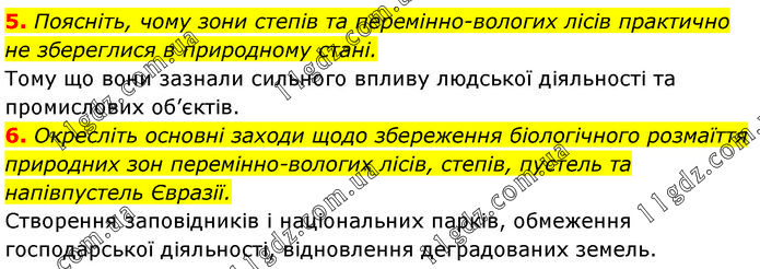 5. Поясніть, чому зони степів та перемінно-вологих лісів практично не збереглися в природному стані. Тому що вони зазнали сильного впливу людської діяльності та промислових об’єктів. 6. Окресліть основні заходи щодо збереження біологічного розмаїття природних зон перемінно-вологих лісів, степів, пустель та напівпустель Євразії. Створення заповідників і національних парків, обмеження господарської діяльності, відновлення деградованих земель.