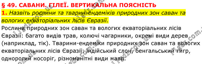 § 49. САВАНИ. ГІЛЕЇ. ВЕРТИКАЛЬНА ПОЯСНІСТЬ 1. Назвіть рослини та тварин-ендеміків природних зон саван та вологих екваторіальних лісів Євразії. Рослини природних зон саван та вологих екваторіальних лісів Євразії: багато видів трав, колючі чагарники, окремі види дерев (наприклад, тік). Тварини-ендеміки природних зон саван та вологих екваторіальних лісів Євразії: індійський слон, бенгальський тигр, однорогий носоріг, різноманітні види мавп.