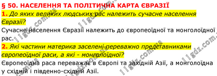 § 50. НАСЕЛЕННЯ ТА ПОЛІТИЧНА КАРТА ЄВРАЗІЇ 1. До яких великих людських рас належить сучасне населення Євразії? Сучасне населення Євразії належить до європеоїдної та монголоїдної рас. 2. Які частини материка заселені переважно представниками європеоїдної раси, а які - монголоїдної? Європеоїдна раса переважає в Європі та західній Азії, а монголоїдна у східній і південно-східній Азії.
