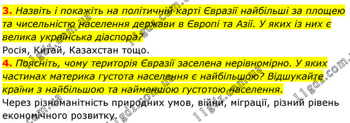 3. Назвіть і покажіть на політичній карті Євразії найбільші за площею та чисельністю населення держави в Європі та Азії. У яких із них є велика українська діаспора? Росія, Китай, Казахстан тощо. 4. Поясніть, чому територія Євразії заселена нерівномірно. У яких частинах материка густота населення є найбільшою? Відшукайте країни з найбільшою та найменшою густотою населення. Через різноманітність природних умов, війни, міграції, різний рівень економічного розвитку.
