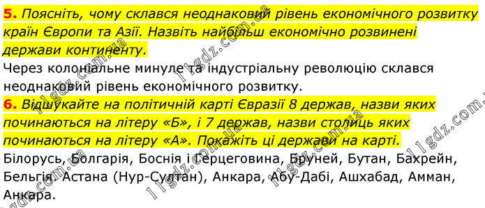 5. Поясніть, чому склався неоднаковий рівень економічного розвитку країн Європи та Азії. Назвіть найбільш економічно розвинені держави континенту. Через колоніальне минуле та індустріальну революцію склався неоднаковий рівень економічного розвитку. 6. Відшукайте на політичній карті Євразії 8 держав, назви яких починаються на літеру «Б», і 7 держав, назви столиць яких починаються на літеру «А». Покажіть ці держави на карті. Білорусь, Болгарія, Боснія і Герцеговина, Бруней, Бутан, Бахрейн, Бельгія. Астана (Нур-Султан), Анкара, Абу-Дабі, Ашхабад, Амман, Анкара.