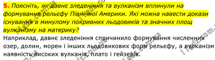 Поясніть, як давнє зледеніння та вулканізм вплинули на формування рельєфу Північної Америки. Які можна навести докази існування в минулому покривних льодовиків та значних площ вулканізму на материку? Наприклад, давнє зледеніння спричинило формування численних озер, долин, морен і інших льодовикових форм рельєфу, а вулканізм наявність високих вулканів, плато і гейзерів.