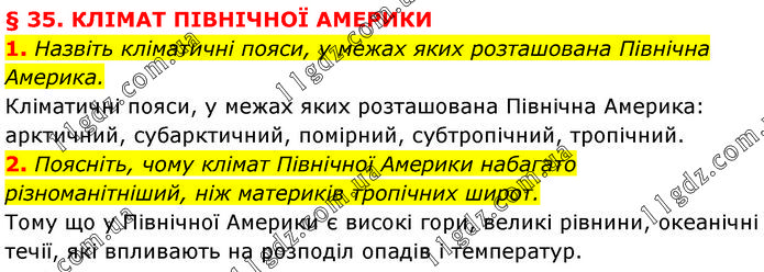 § 35. КЛІМАТ ПІВНІЧНОЇ АМЕРИКИ 1. Назвіть кліматичні пояси, у межах яких розташована Північна Америка. Кліматичні пояси, у межах яких розташована Північна Америка: арктичний, субарктичний, помірний, субтропічний, тропічний. 2. Поясніть, чому клімат Північної Америки набагато різноманітніший, ніж материків тропічних широт. Тому що у Північної Америки є високі гори, великі рівнини, океанічні течії, які впливають на розподіл опадів і температур.