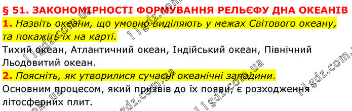 § 51. ЗАКОНОМІРНОСТІ ФОРМУВАННЯ РЕЛЬЄФУ ДНА ОКЕАНІВ 1. Назвіть океани, що умовно виділяють у межах Світового океану, та покажіть їх на карті. Тихий океан, Атлантичний океан, Індійський океан, Північний Льодовитий океан. 2. Поясніть, як утворилися сучасні океанічні западини. Основним процесом, який призвів до їх появи, є розходження літосферних плит.