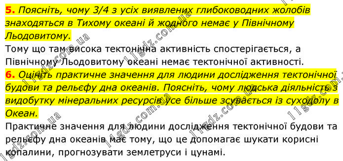 5. Поясніть, чому 3/4 з усіх виявлених глибоководних жолобів знаходяться в Тихому океані й жодного немає у Північному Льодовитому. Тому що там висока тектонічна активність спостерігається, а Північному Льодовитому океані немає тектонічної активності. 6. Оцініть практичне значення для людини дослідження тектонічної будови та рельєфу дна океанів. Поясніть, чому людська діяльність з видобутку мінеральних ресурсів усе більше зсувається із суходолу в Океан. Практичне значення для людини дослідження тектонічної будови та рельєфу дна океанів має тому, що це допомагає шукати корисні копалини, прогнозувати землетруси і цунамі.