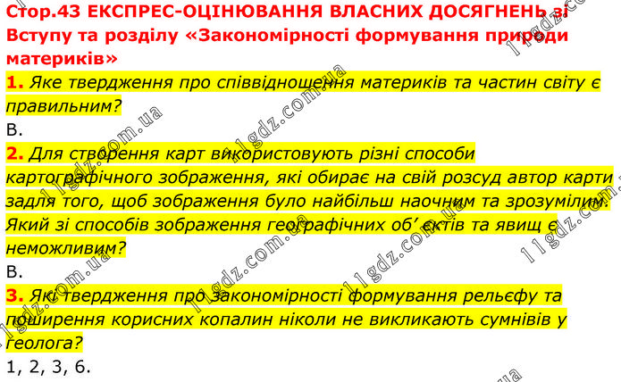 ЕКСПРЕС-ОЦІНЮВАННЯ ВЛАСНИХ ДОСЯГНЕНЬ зі Вступу та розділу «Закономірності формування природи материків» 1. Яке твердження про співвідношення материків та частин світу є правильним? В. 2. Для створення карт використовують різні способи картографічного зображення, які обирає на свій розсуд автор карти задля того, щоб зображення було найбільш наочним та зрозумілим. Який зі способів зображення географічних об’ єктів та явищ є неможливим? В. 3. Які твердження про закономірності формування рельєфу та поширення корисних копалин ніколи не викликають сумнівів у геолога? 1, 2, 3, 6.