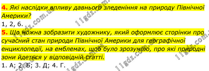 4. Які наслідки впливу давнього зледеніння на природу Північної Америки? 1, 2, 6. 5. Що можна зобразити художнику, який оформлює сторінки про сучасний стан природи Північної Америки для географічної енциклопедії, на емблемах, щоб було зрозуміло, про які природні зони йдеться у відповідній статті. 1. А; 2. Б; 3. Д; 4. Г.