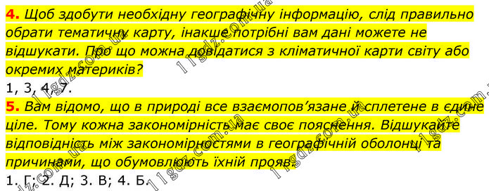 4. Щоб здобути необхідну географічну інформацію, слід правильно обрати тематичну карту, інакше потрібні вам дані можете не відшукати. Про що можна довідатися з кліматичної карти світу або окремих материків? 1, 3, 4, 7. 5. Вам відомо, що в природі все взаємопов’язане й сплетене в єдине ціле. Тому кожна закономірність має своє пояснення. Відшукайте відповідність між закономірностями в географічній оболонці та причинами, що обумовлюють їхній прояв. 1. Г; 2. Д; 3. В; 4. Б.