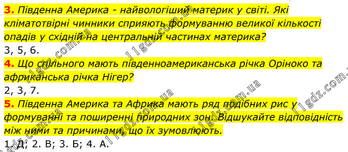 3. Південна Америка - найвологіший материк у світі. Які кліматотвірні чинники сприяють формуванню великої кількості опадів у східній на центральній частинах материка? 3, 5, 6. 4. Що спільного мають південноамериканська річка Оріноко та африканська річка Нігер? 2, 3, 7. 5. Південна Америка та Африка мають ряд подібних рис у формуванні та поширенні природних зон. Відшукайте відповідність між ними та причинами, що їх зумовлюють. 1. Д; 2. В; 3. Б; 4. А.