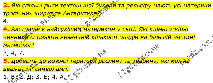 3. Які спільні риси тектонічної будови та рельєфу мають усі материки тропічних широт та Антарктида? 4. 4. Австралія є найсухішим материком у світі. Які кліматотвірні чинники сприяють незначній кількості опадів на більшій частині материка? 3, 4, 7. 5. Доберіть до кожної території рослину та тварину, які можна вважати її символами. 1. В; 2. Д; 3. Б; 4. А.