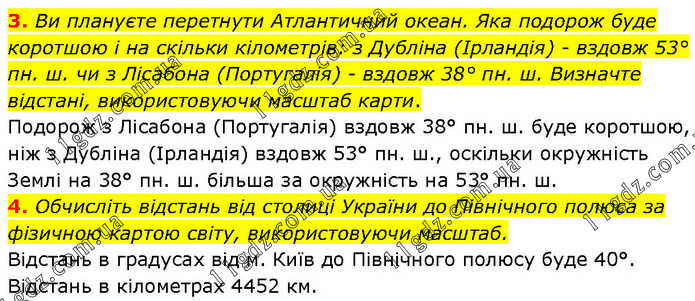 3. Ви плануєте перетнути Атлантичний океан. Яка подорож буде коротшою і на скільки кілометрів: з Дубліна (Ірландія) - вздовж 53° пн. ш. чи з Лісабона (Португалія) - вздовж 38° пн. ш. Визначте відстані, використовуючи масштаб карти. Подорож з Лісабона (Португалія) вздовж 38° пн. ш. буде коротшою, ніж з Дубліна (Ірландія) вздовж 53° пн. ш., оскільки окружність Землі на 38° пн. ш. більша за окружність на 53° пн. ш. 4. Обчисліть відстань від столиці України до Північного полюса за фізичною картою світу, використовуючи масштаб. Відстань в градусах від м. Київ до Північного полюсу буде 40°. Відстань в кілометрах 4452 км.