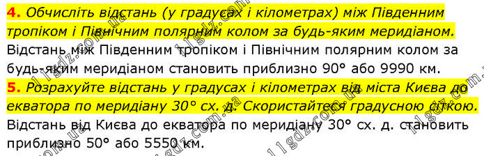 4. Обчисліть відстань (у градусах і кілометрах) між Південним тропіком і Північним полярним колом за будь-яким меридіаном. Відстань між Південним тропіком і Північним полярним колом за будь-яким меридіаном становить приблизно 90° або 9990 км. 5. Розрахуйте відстань у градусах і кілометрах від міста Києва до екватора по меридіану 30° сх. д. Скористайтеся градусною сіткою. Відстань від Києва до екватора по меридіану 30° сх. д. становить приблизно 50° або 5550 км.