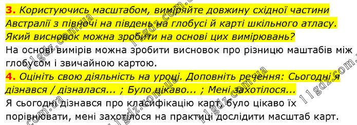 3. Користуючись масштабом, виміряйте довжину східної частини Австралії з півночі на південь на глобусі й карті шкільного атласу. Який висновок можна зробити на основі цих вимірювань? На основі вимірів можна зробити висновок про різницю маштабів між глобусом і звичайною картою. 4. Оцініть свою діяльність на уроці. Доповніть речення: Сьогодні я дізнався / дізналася... ; Було цікаво... ; Мені захотілося... Я сьогодні дізнався про класифікацію карт, було цікаво їх порівнювати, мені захотілося на практиці дослідити масштаб карт.