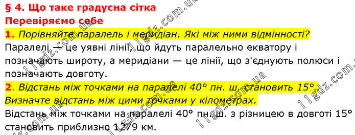 § 4. Що таке градусна сітка Перевіряємо себе 1. Порівняйте паралель і меридіан. Які між ними відмінності? Паралелі — це уявні лінії, що йдуть паралельно екватору і позначають широту, а меридіани — це лінії, що з'єднують полюси і позначають довготу. 2. Відстань між точками на паралелі 40° пн. ш. становить 15°. Визначте відстань між цими точками у кілометрах. Відстань між точками на паралелі 40° пн. ш. з різницею в довготі 15° становить приблизно 1279 км.