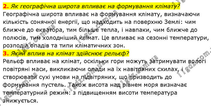 2. Як географічна широта впливає на формування клімату? Географічна широта впливає на формування клімату, визначаючи кількість сонячної енергії, що надходить на поверхню Землі: чим ближче до екватора, тим більше тепла, і навпаки, чим ближче до полюсів, тим холодніший клімат. Це впливає на сезонні температури, розподіл опадів та типи кліматичних зон. 3. Який вплив на клімат здійснює рельєф? Рельєф впливає на клімат, оскільки гори можуть затримувати вологі повітряні маси, викликаючи опади на їх навітряних схилах, і створювати сухі умови на підвітряних, що призводить до формування пустель. Також висота над рівнем моря визначає температурний режим: з підвищенням висоти температура знижується.