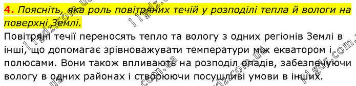 4. Поясніть, яка роль повітряних течій у розподілі тепла й вологи на поверхні Землі. Повітряні течії переносять тепло та вологу з одних регіонів Землі в інші, що допомагає зрівноважувати температури між екватором і полюсами. Вони також впливають на розподіл опадів, забезпечуючи вологу в одних районах і створюючи посушливі умови в інших.