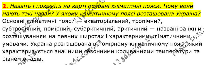 2. Назвіть і покажіть на карті основні кліматичні пояси. Чому вони мають такі назви? У якому кліматичному поясі розташована Україна? Основні кліматичні пояси — екваторіальний, тропічний, субтропічний, помірний, субарктичний, арктичний — названі за їхнім розташуванням на певних широтах і характерними кліматичними умовами. Україна розташована в помірному кліматичному поясі, який характеризується значними сезонними коливаннями температури та рівнем опадів.