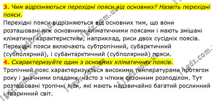 3. Чим відрізняються перехідні пояси від основних? Назвіть перехідні пояси. Перехідні пояси відрізняються від основних тим, що вони розташовані між основними кліматичними поясами і мають змішані кліматичні характеристики, наприклад, риси двох сусідніх поясів. Перехідні пояси включають субтропічний, субарктичний (субполярний), і субантарктичний (субполярний) пояси. 4. Схарактеризуйте один з основних кліматичних поясів. Тропічний пояс характеризується високими температурами протягом року і значними опадами, часто з чітким сезонним розподілом. Тут розташовані тропічні ліси, які мають надзвичайно багатий рослинний і тваринний світ.